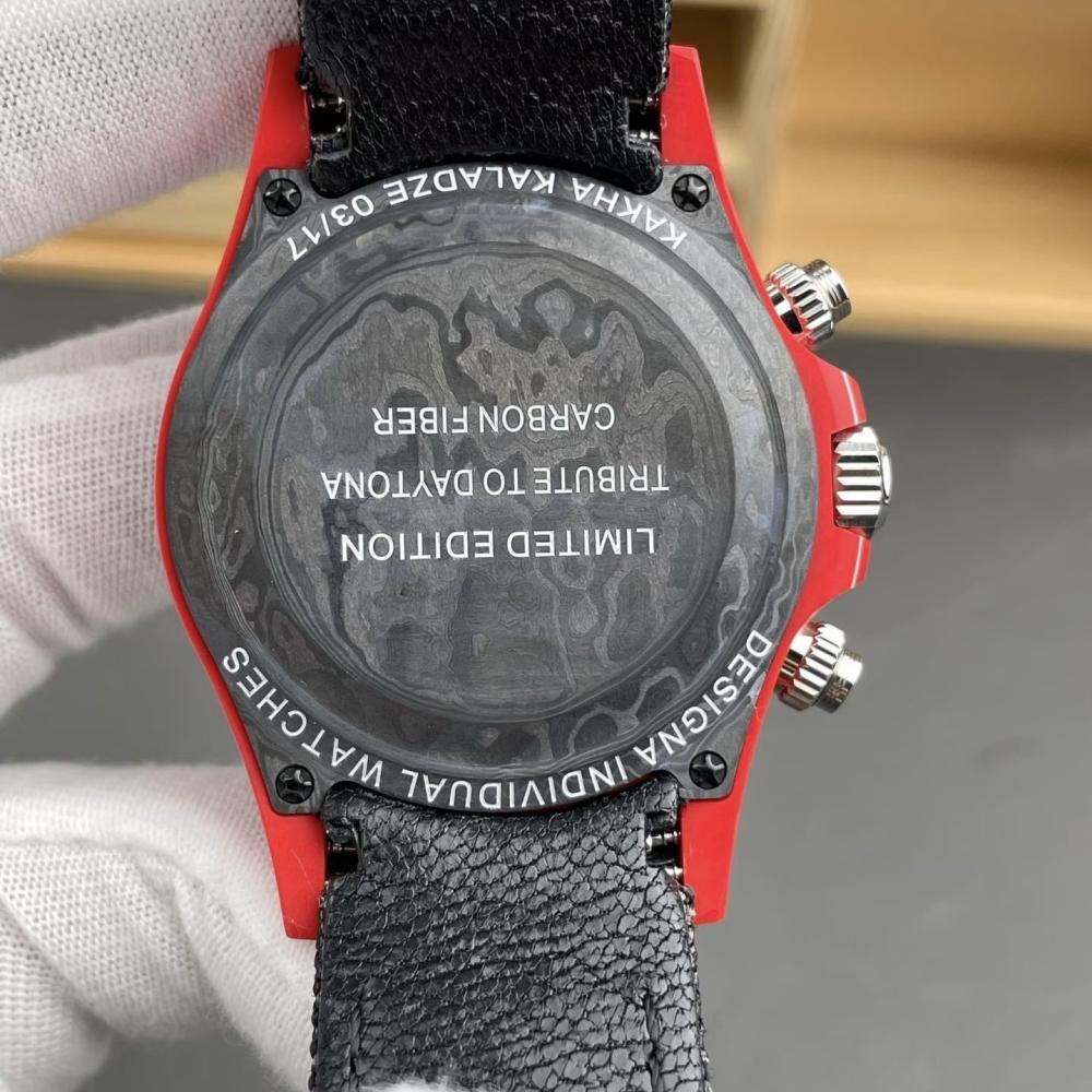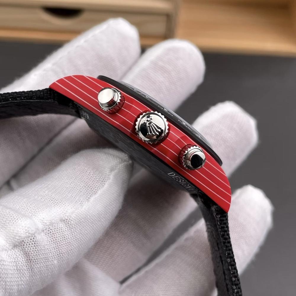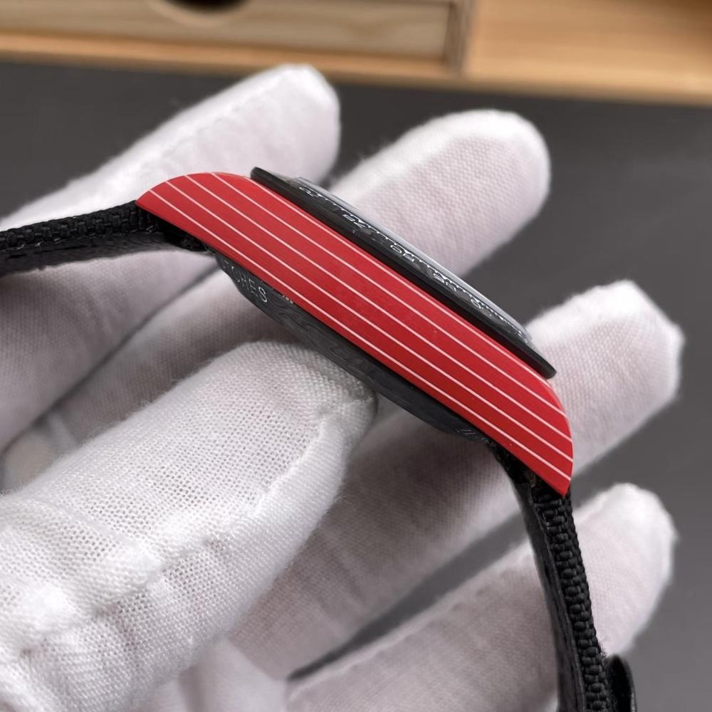 ساعة تخطف الأنظار بتصميمها الجريء وهيكل الكربون الأحمر الفريد، تجمع بين الأداء الرياضي والمظهر العصري.