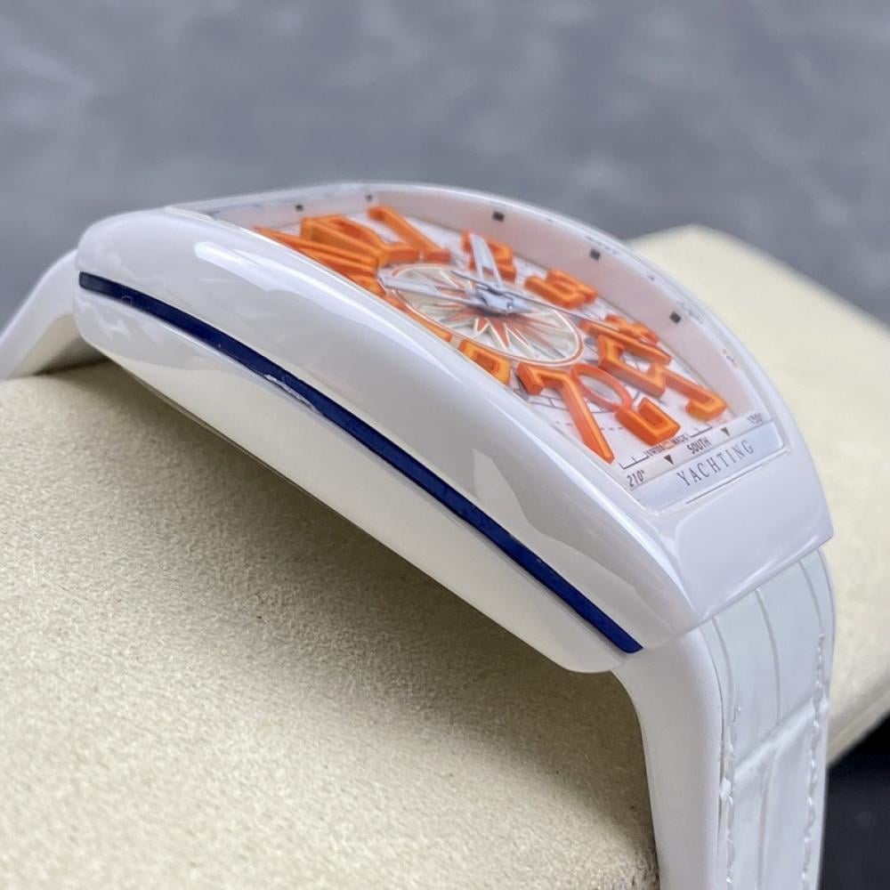 المينا: أبيض مع أرقام بارزة باللون البرتقالي بتصميم ثلاثي الأبعاد ولمسات ياختينغ المميزة, وكل رقم صُنع بقالب مستقل للحصول على انحناءات دقيقة وتناسق مثالي